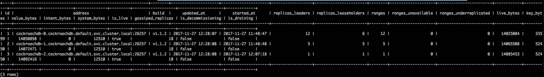 kubectl run cockroachdb -it --image=cockroachdb/cockroach \--rm --restart=Never \-- node status --all --insecure --host=cockroachdb-public