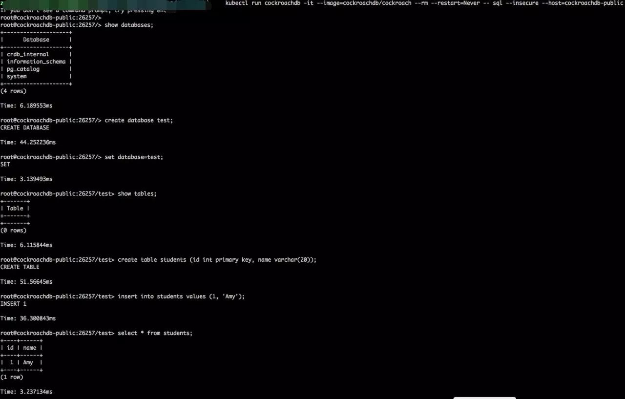 kubectl run cockroachdb -it --image=cockroachdb/cockroach --rm --restart=Never --node atus --all --insecure --host=cockroachdb-public