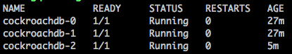 通过kubectl,发现3个CockroachDB节点pods仍在运行,cockroachdb-2 pods因为被自动补齐,运行时间比另外两个节点短。