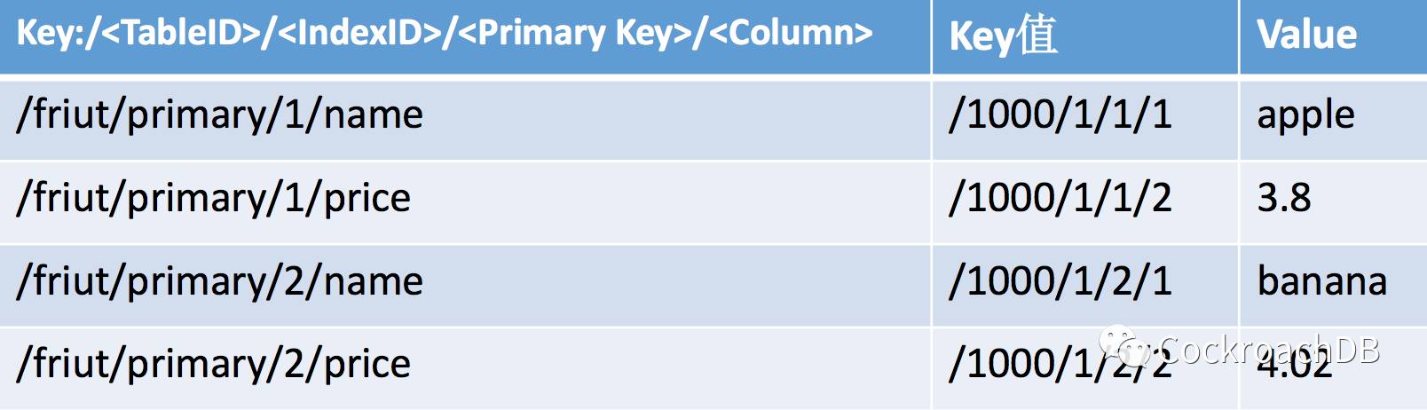 在CockroachDB中,所有的Table必须包含一个主键(若建表时无显式声明主键,则系统默认创建)。每列数据构成一个Key-Value存储单元。Key就是每个存储单元值的地址,如/<TableID>/<IndexID>/<Primary Key>/<Column>。举个例子,我们创建一张水果价格表: