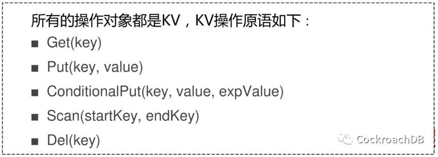 对于Key-Value存储单元,分布式KV存储层对外提供了操作原语接口,SQL层通过调用KV操作原语接口实现对KV对象的增删改查操作。