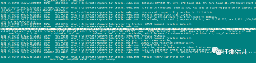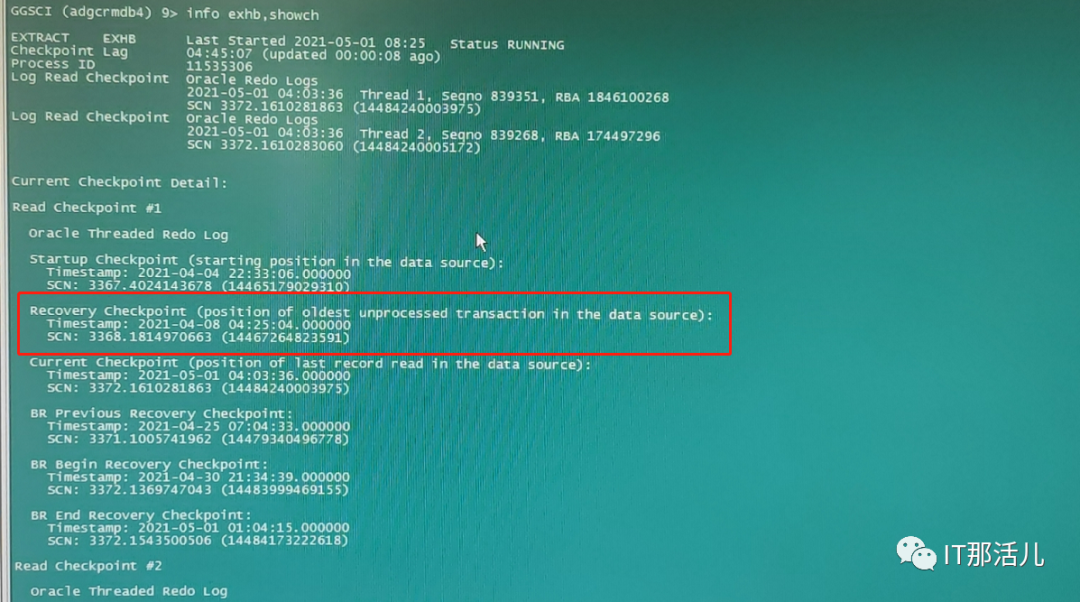 根据Recovery checkpoint找到事务ID,是一个月前的长事务,跟踪sql信息后,发现是可以跳过的。send extract name,skiptrans 1079.8.71844665 后重启抽取进程,队里文件开始正常增长。
