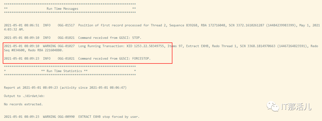 和原厂工程师确定,只要长事务中不涉及到抽取表的操作,可以在OGG端提交该事物或跳过该事物,根据日志中的Long Running Transaction: XID 1253.22.58349755 在源端数据库中确定SQLID