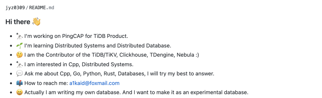 “其实你在腾讯做后台开发也好,在 PingCAP 做 Cloud 也好,包括你自己 GitHub 的 Profile 里都提到了一个词“Database”,所以你是更倾向于去做一些偏底层、Infra 的一些技术开发吗?这是实习过程中发现自己的兴趣所向呢?还是一早就规划好的呢?”
