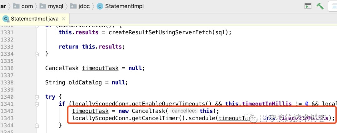 在sql执行时,如果设置了statement timeout,则将sql包装成一个task,通过Timer进行执行:mysql 驱动源码里有多处使用到了这个Timer,这里以StatementImpl的executeQuery方法为例进行讲解,包含了以下代码片段: