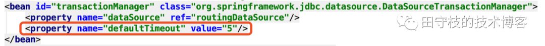 例如,我们在采用spring配置事务管理器的时候,可以指定一个defaultTimeout属性,单位是秒,指定所有事务的默认超时时间。