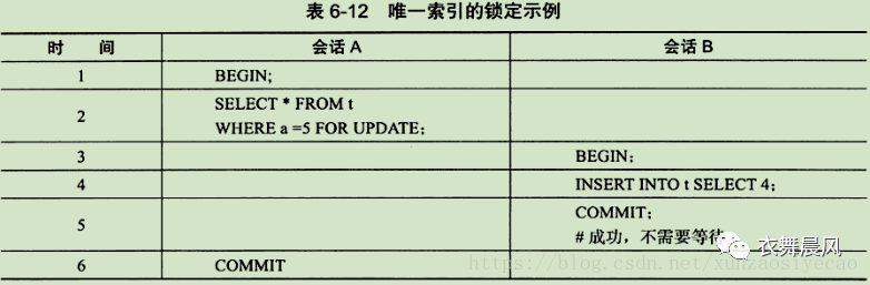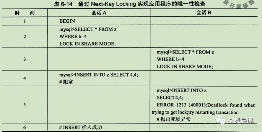 如果用户通过索引査询一个值,并对该行加上一个SLock,那么即使査询的值不在,其锁定的也是一个范围,因此若没有返回任何行,那么新插人的值一定是唯一的。也许有读者会有疑问,如果在进行第一步SELECT •••LOCK IN SHARE MODE操作时,有多个事务并发操作,那么这种唯一性检査机制是否存在问题。其实并不会,因为这时会导致死锁,只有一个事务的插人操作会成功,而其余的事务会抛出死锁的错误,如表6-14所示。