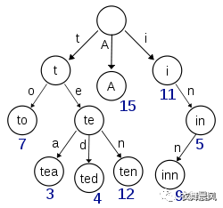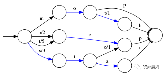 将单词分成单个字母通过⭕️和–>表示出来,0权重不显示。如果⭕️后面出现分支,就标记权重,最后整条路径上的权重加起来就是这个单词对应的序号。