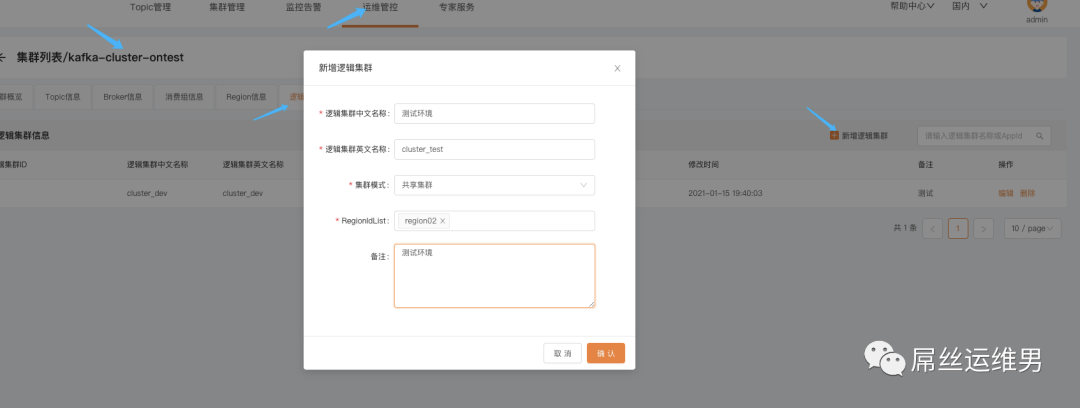创建逻辑集群的入口:运维管控—》选择一个物理集群点进去—》逻辑集群信息—》新增逻辑集群