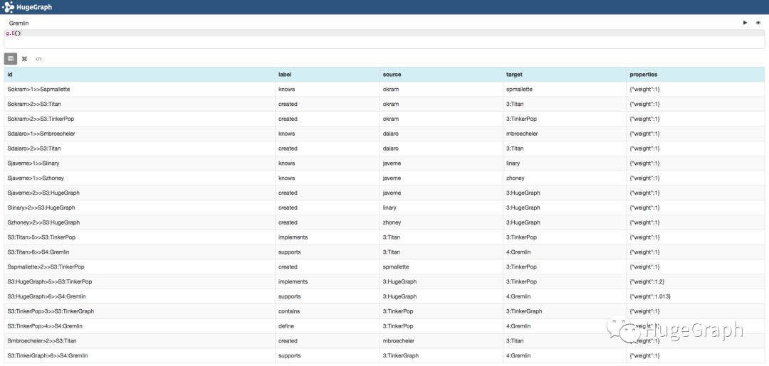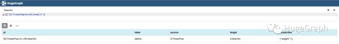 // 根据id查询边g.E('S3:TinkerPop>4>>S4:Gremlin')