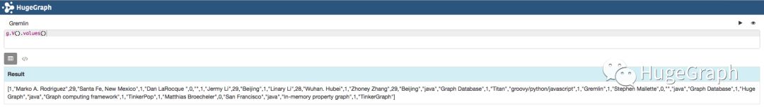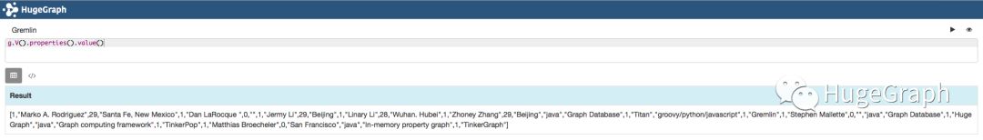 // 查询所有顶点的属性值// 效果等同于:// g.V().properties().value()g.V().values()