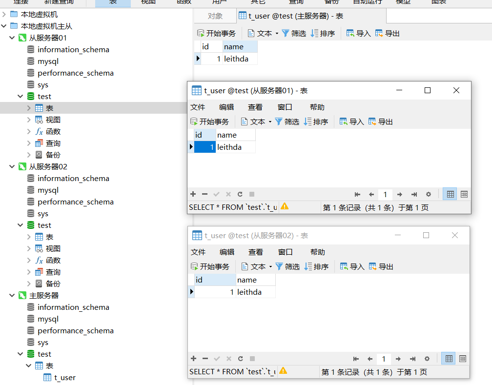 使用Navicat分别连接三个服务器,在主服务器上创建测试数据库、新增表t_user并增加一行数据。查看从服务器,主从功能正常。
