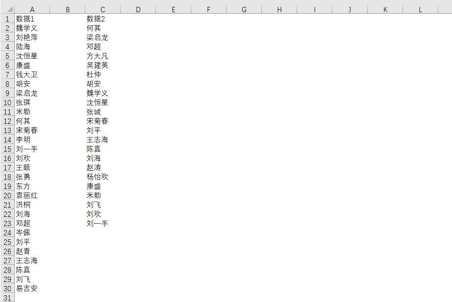Sub GetData(control As IRibbonControl)Dim Dic As ObjectDim aData, arr, aRes, N, MatDim intX&, MaxN&aData = Range("A1").CurrentRegionarr = Range("C1").CurrentRegionMaxN = IIf(UBound(aData) > UBound(arr), UBound(aData), UBound(arr))ReDim aRes(1 To MaxN, 1 To 5)N = Array(1, 1, 1)Set Dic = CreateObject("Scripting.Dictionary")For intX = 2 To UBound(aData) '循环遍历数据1的数据源Dic(aData(intX, 1)) = "数据1" '名字作为关键字写入字典,对应的Item为数据1aRes(intX, 1) = aData(intX, 1)NextFor intX = 2 To UBound(arr)If Dic.exists(arr(intX, 1)) Then '判断字典中是否包含关键字N(0) = N(0) + 1 '计数器累加aRes(N(0), 3) = arr(intX, 1) '写入结果数组Dic(arr(intX, 1)) = "相同" '修改关键字对应的条目ElseN(1) = N(1) + 1aRes(N(1), 4) = arr(intX, 1)Dic(arr(intX, 1)) = "数据2" '名字作为关键字写入字典,对应的Item为数据2End IfaRes(intX, 2) = arr(intX, 1)NextFor Each Mat In Dic.keys '遍历字典中的KeyIf Dic(Mat) = "数据1" Then '判断关键字对应的条目是否数据1N(2) = N(2) + 1aRes(N(2), 5) = MatEnd IfNextaRes(1, 1) = "数据1": aRes(1, 2) = "数据2": aRes(1, 3) = "两表相同": aRes(1, 4) = "数据2独有": aRes(1, 5) = "数据1独有"Range("E1").Resize(UBound(aRes), UBound(aRes, 2)) = aResSet Dic = NothingEnd Sub