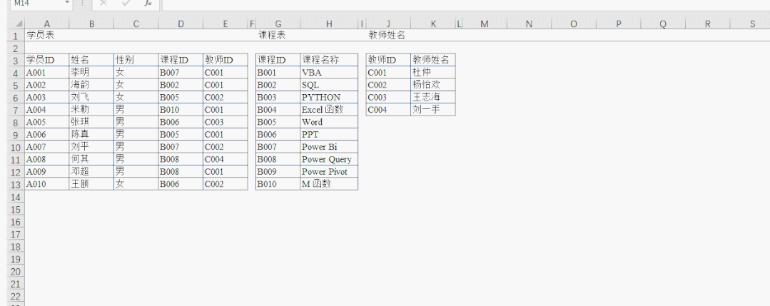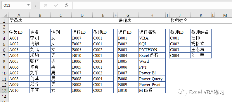学员表.课程ID=课程表.课程ID 而 课程表.课程名称=教师姓名.课程名称