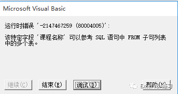 strSQL = "Select 学员ID,姓名,性别,课程名称 ,教师姓名 From "strSQL = strSQL & "(" & strSource & "a Inner Join " & strSource1 & "b on a.课程ID=b.课程ID) "strSQL = strSQL & "Inner Join " & strSource2 & "c On b.课程名称=c.课程名称"