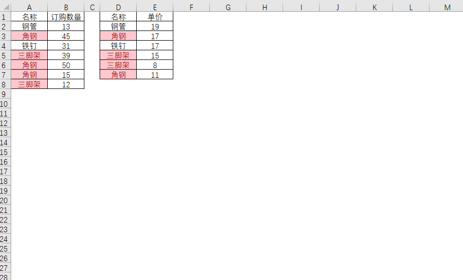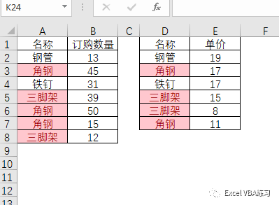 这是一份采购列表,AB列为采购数量 DE列为采购单价