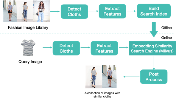 在线部分是图片搜索的过程。查询图片同样经过服装检测、特征提取后得到特征向量。基于该特征向量,使用向量数据库 Milvus 搜索得到 TopK 个相似向量以及相对应的图片 ID。最后经过后处理(筛选、重排序等)后得到与查询图片的服装相似的图片集合。