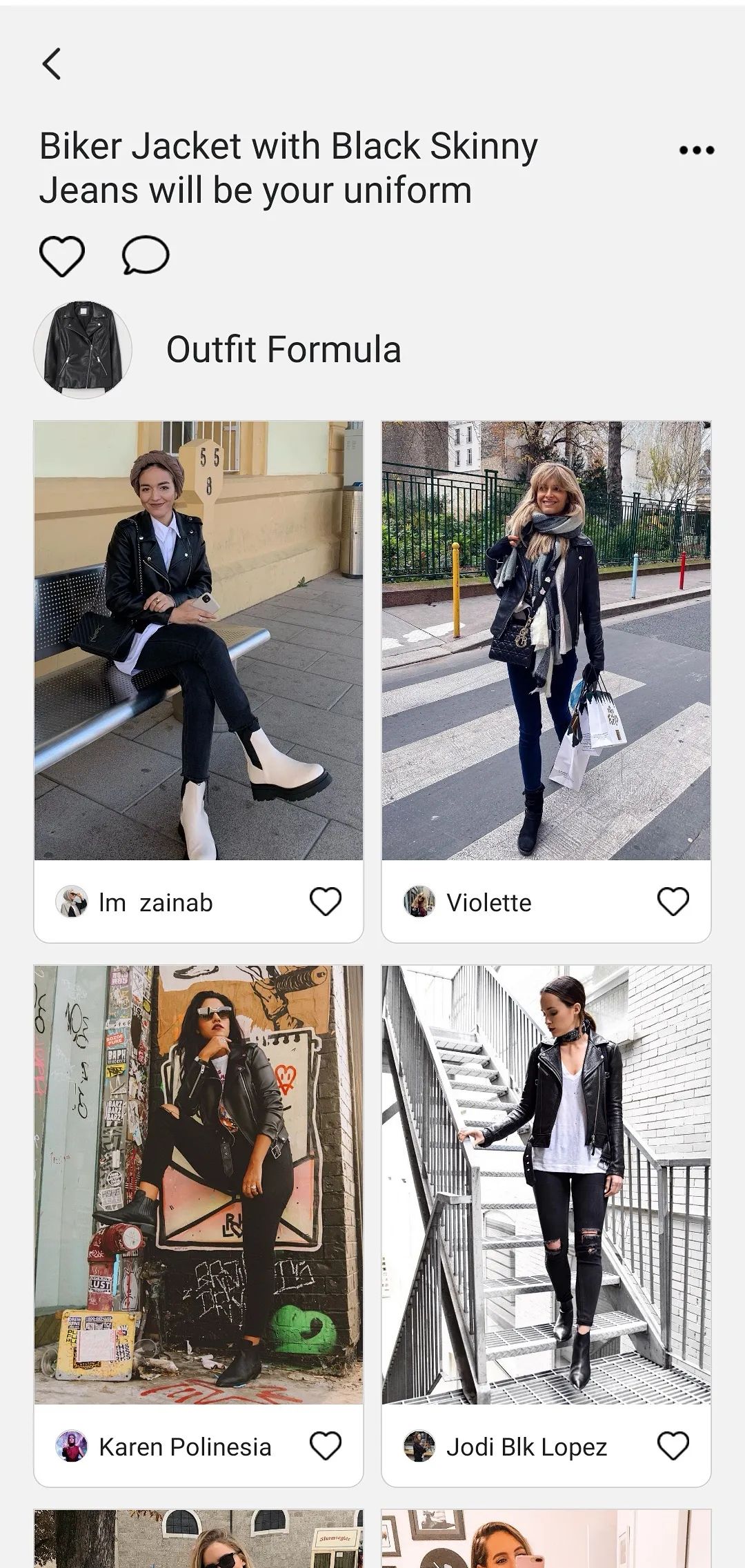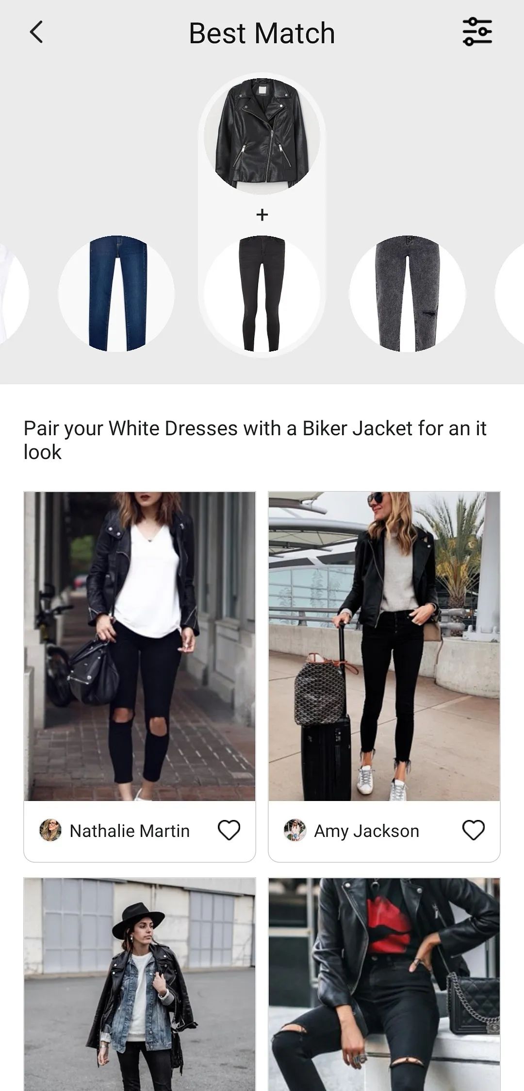 通过商品图和街拍图之间的相似搜索,可以找到含有特定单品的所有街拍图。然后通过与之搭配的另一件单品的聚类,形成对用户有价值的搭配建议。如下图所示,一件黑夹克可以和很多单品搭配,其中一种是黑色牛仔裤。