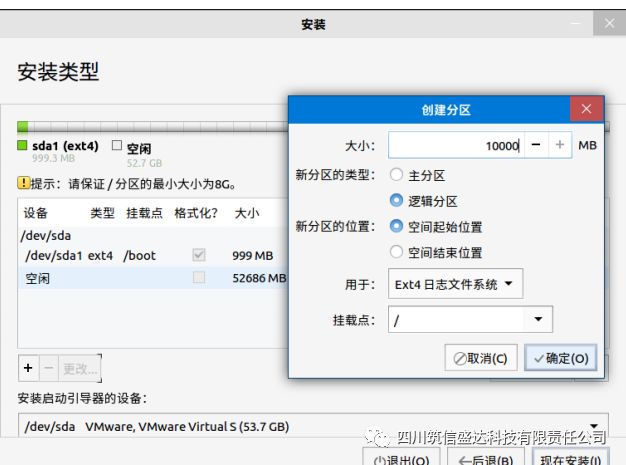 /(根分区)等同Windows下C盘 | 主分区;大小不能小于8G,长城提供的硬盘为1TB,分区大小最好为100GB |
