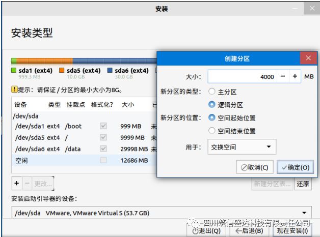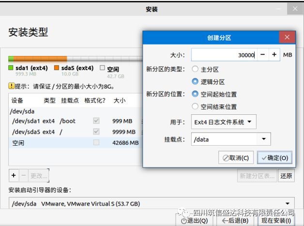 /data(数据分区)等同于 windows 下 D 盘 | 逻辑分区;银河麒麟无法像windows划分多个数据分区,建议分区大小800G |