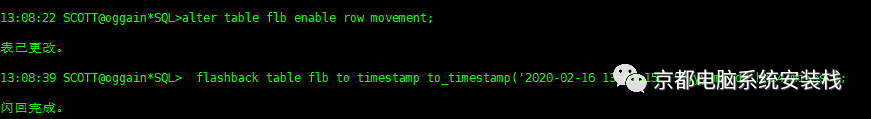 使能行移动(测试表):alter table falb enable row movement;flashback table flb to timestamp to_timestamp('2020-02-16 13:07:15','yyyy-mm-dd hh24:mi:ss');