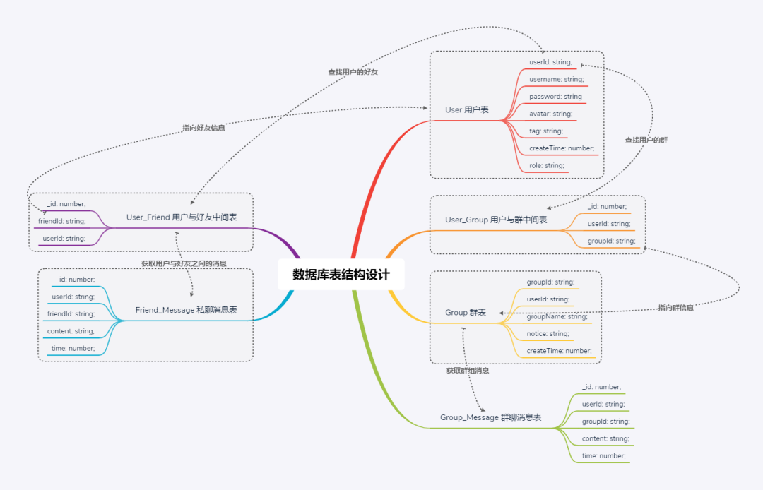 其中中间表用于建立对于群/好友与用户之间的联系。下面是我画的思维导图,相信大家看完就能理解其中的奥妙啦。