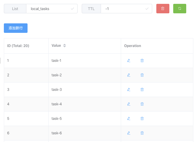 在这段脚本中,我们从 utils.ts 中获取了各个 Redis 操作的方法,以及任务的名称 TASKNAME (此处为 localtasks)和任务的总数 TASKAMOUNT(此处为 20 个)。通过 LPUSH 方法往 TASKNAME 的 List 当中塞入内容为 task-1 到 task-20 的任务,如图所示: