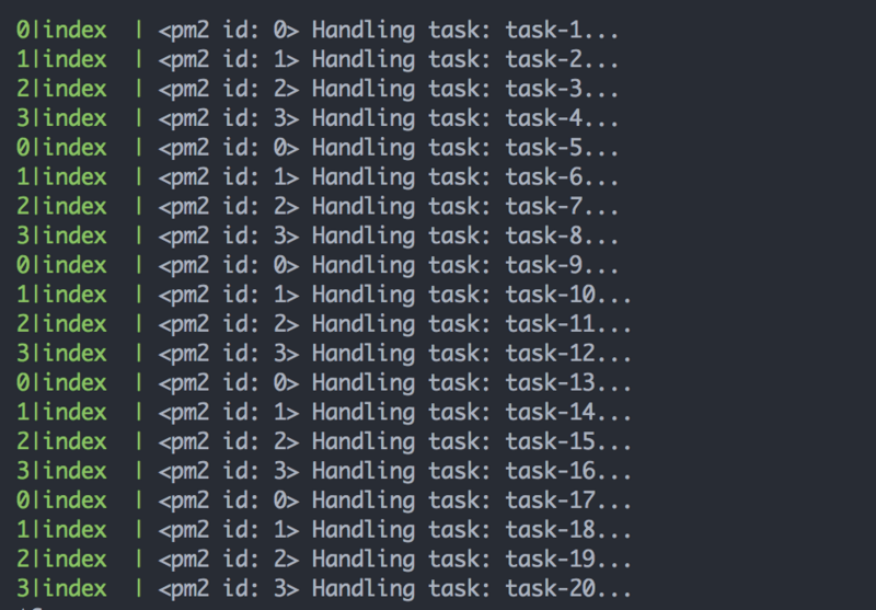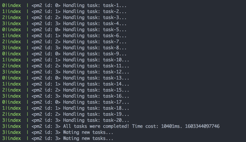 最后来看一下实际的运行效果。我们循例往队列里面添加了 task-1 到 task-20 这 20 个任务,然后启动 4 个进程来跑: