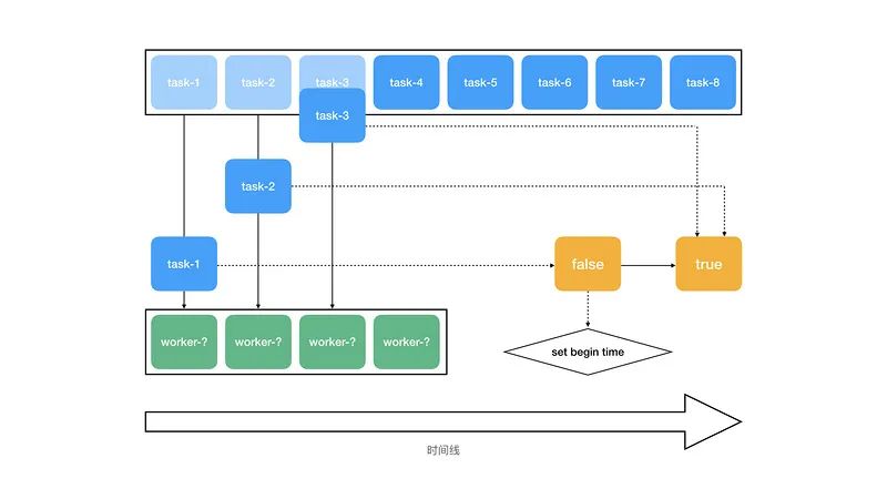 如图所示,绿色的 worker 由于无法保证运行的先后顺序,所以编号用问号来表示。当第一个任务被取得时,把黄色的标记值从 false 设置成 true。当且仅当黄色的标记值为 false 时才会设置时间。这样一来,当其他任务被取得时,由于黄色的标记值已经是 true 了,因此无法设置时间,所以我们便能得到首个任务被取得的时间。