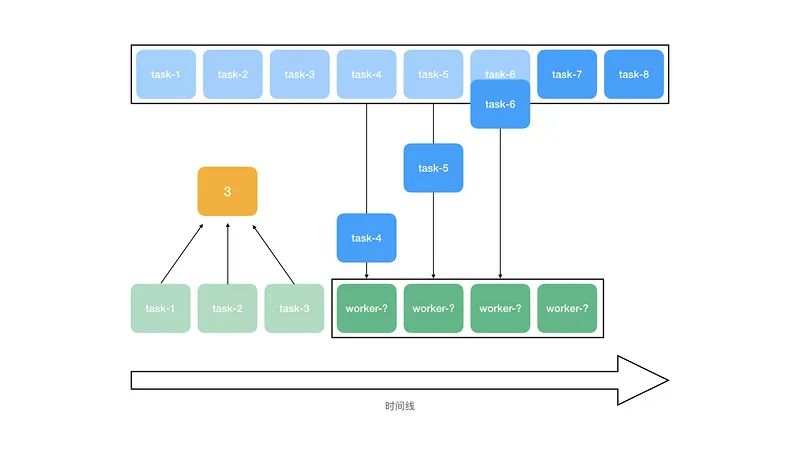 任务处理器可以有多个,它们同时从队列里面把任务取走并处理。当任务队列为空,表示所有任务已经被认领完;当所有任务处理器完成任务,则表示所有任务已经被处理完。