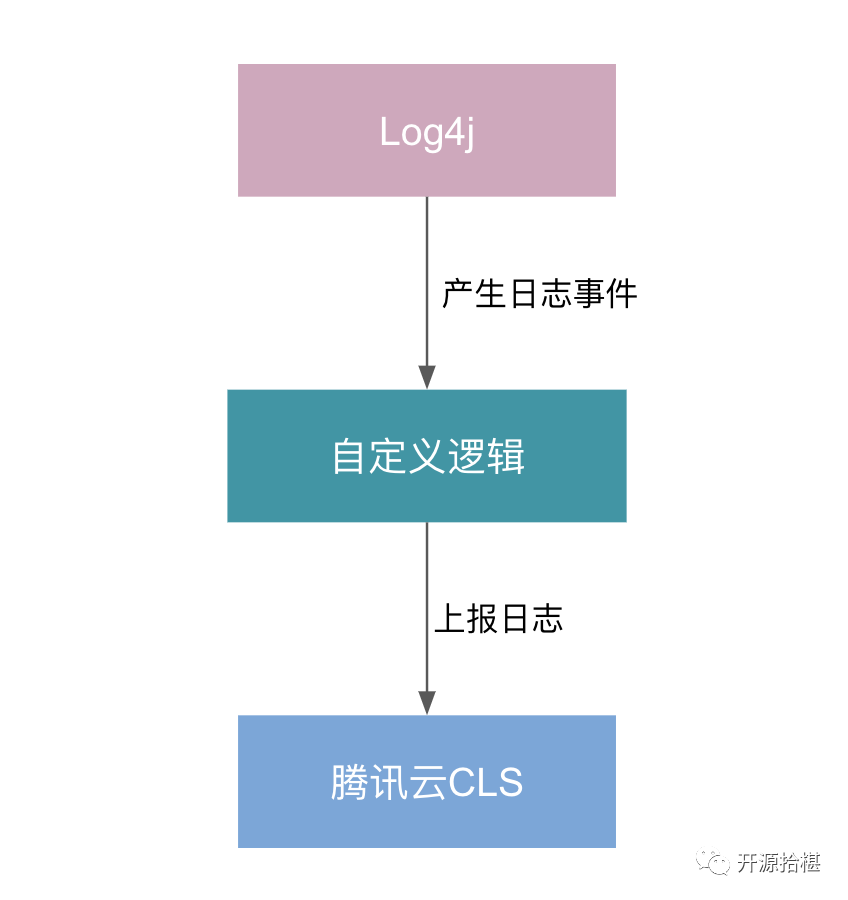 Log4j需要实现自定义Appender需要继承org.apache.log4j.AppenderSkeleton,Log4j日志输出是通过事件驱动来完成的,所以在核心逻辑中,我们只需要获取事件携带的信息,并且调用云API,将这些事件中携带的信息上传即可,逻辑图如下