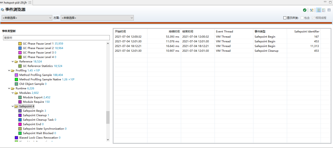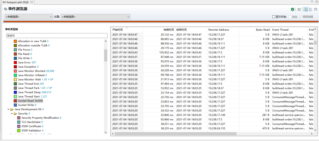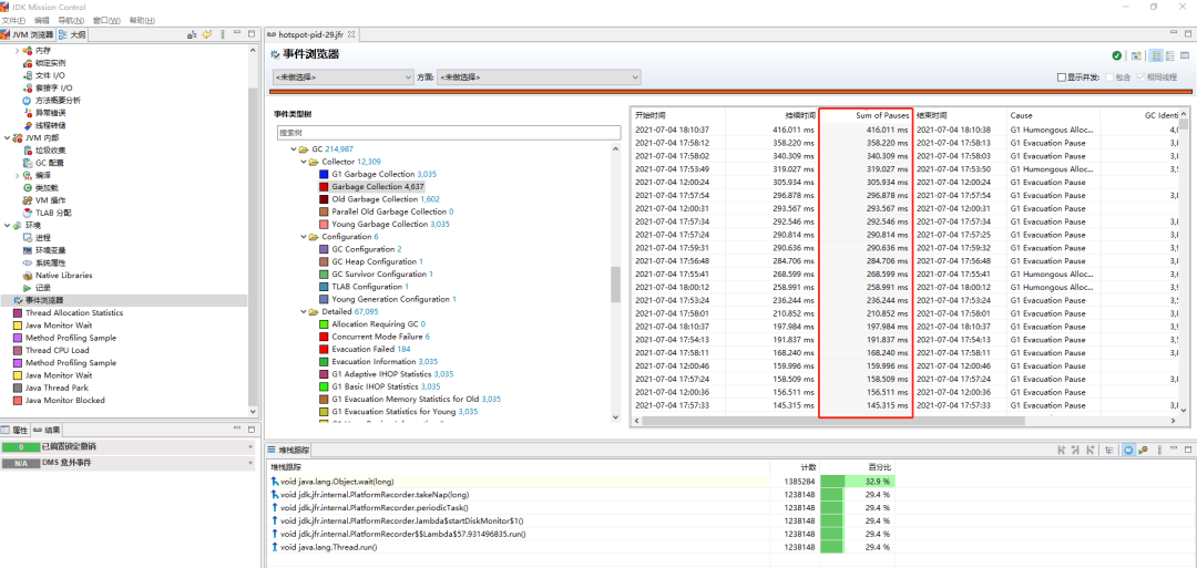 由于半小时后,服务实例恢复正常,并且出现请求极慢的次数并不太多,没有能及时打印出现问题的时候线程堆栈采集相关信息。但是,我们有自己的法宝,JFR(关于 JFR,请参考我的另一系列JFR全解)。