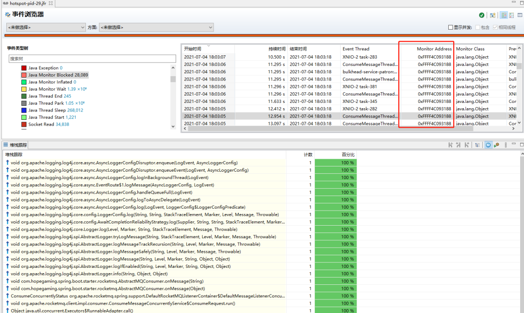 首先,对于 Java Monitor Blocked 这个事件,我们可以通过 Monitor Address 来判断是否是同一个锁。例如这里我们发现这些线程都是阻塞在 FFFF 4C09 3188