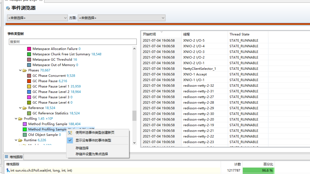 我们来看下当时的消费线程是否有异常,由于当时硬盘 io 看系统监控并没有异常,所以这个线程很大可能是 Runnable 的,不断的在写入日志。同时,我们知道,写入文件 java 底层基于 native 调用,所以我们查看 JFR 的 native 方法采集。使用事件查看器中的 Method Profiling Sample Native,右键点击,并选择“使用所选类型事件创建新页”: