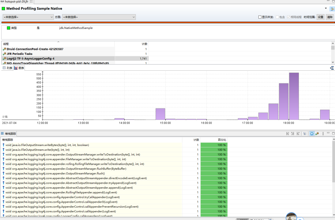 在创建出来的新页中,按照线程分组查看,查看 Log4j2 的 disruptor 消费线程,可以得出下图: