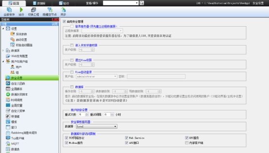 在安全设置画面中,可对进入集成开发环境、退出VIEW客户端、数据库的操作以及读写数据进行权限设置;支持指定远程登录服务器和用于电子签名的安全审核服务器;在设置了数据库点的所属用户组后,可限制外部程序对数据库点的安全访问。