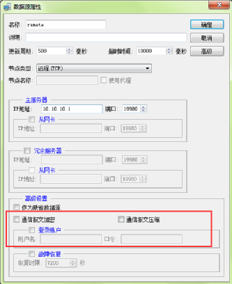 在数据源的属性对话框中设置连接数据源使用的用户,以及通讯报文是否加密,实现数据源的安全访问限制。