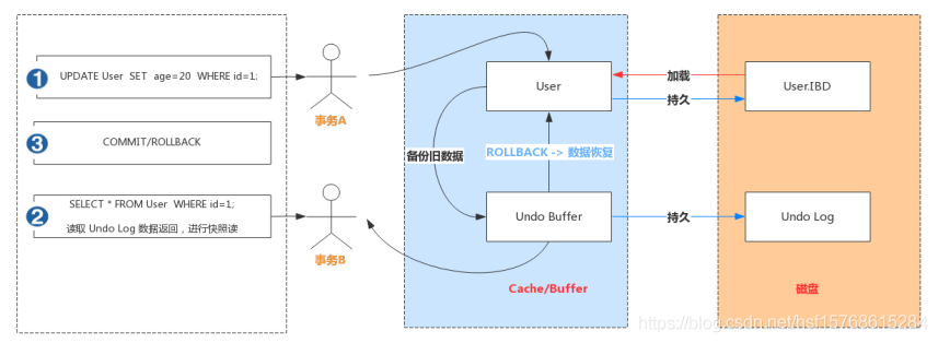 MVCC:事务未提交之前,Undo Log保存了未提交之前的版本数据,Undo Log中的数据可作为数据旧版本快照供其他并发事务进行快照读。事务A手动开启事务,执行更新操作,首先会把更新命中的数据备份到 Undo Buffer 中。事务B手动开启事务,执行查询操作,会读取 Undo 日志数据返回,进行快照读。