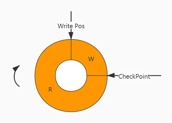 Write Pos和CheckPoint之间还空着的部分,可以用来记录新的操作。如果Write Pos追上CheckPoint,表示写满,这时候不能再执行新的更新,会停下来先擦掉一些记录。如图:W区则是可以写入的区域,R区则是需要刷盘的内容。