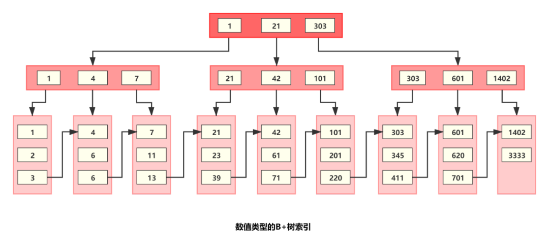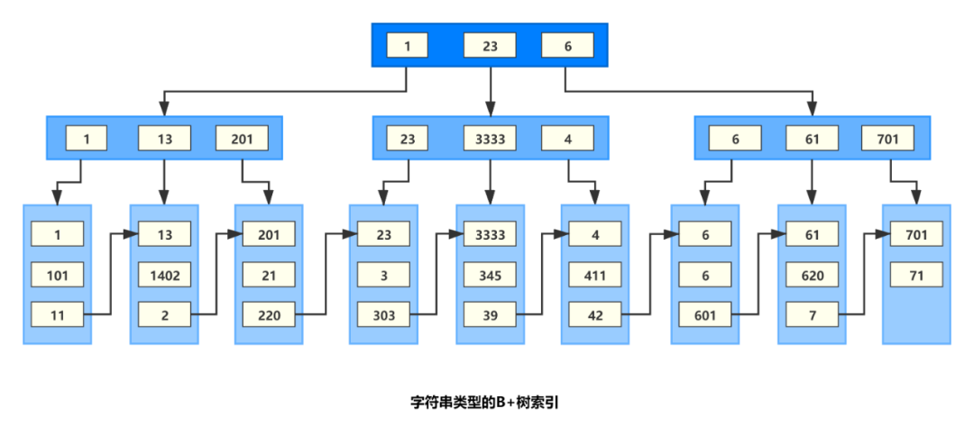 当作为字符串类型建立索引时,数据顺序和B+树索引结构如下: