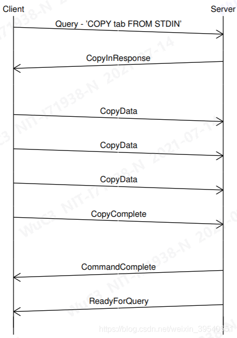 服务端收到 COPY 命令后,进入 COPY 模式,并回复 CopyInResponse。随后客户端通过 CopyData 消息传输数据,CopyComplete 消息标识数据传输完成,服务端收到该消息后,发送 CommandComplete 和 ReadyForQuery 消息。