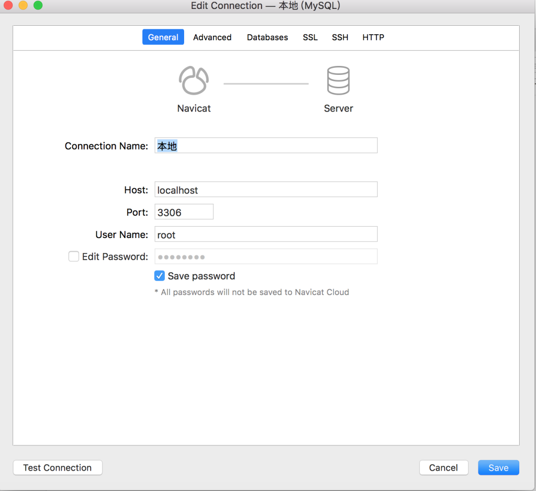 只需第一次连接数据库时配置:Connection Name、Host、Port、User Name,然后勾选 Save password即可。
