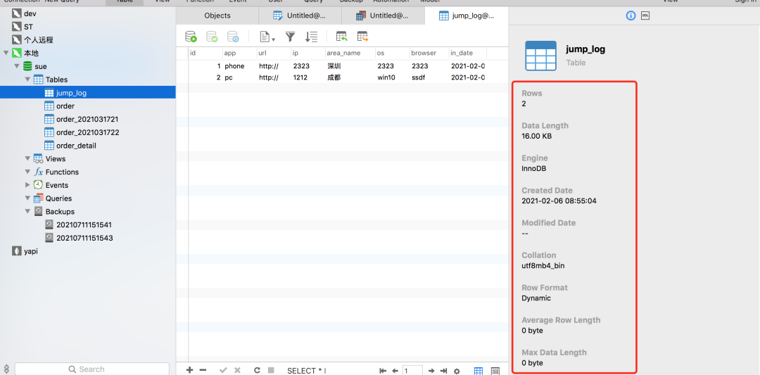 里面能清楚的看到表中的这些信息:记录行数、数据占用磁盘空间的大小、存储引擎、创建日期、修改日期、字符集等。