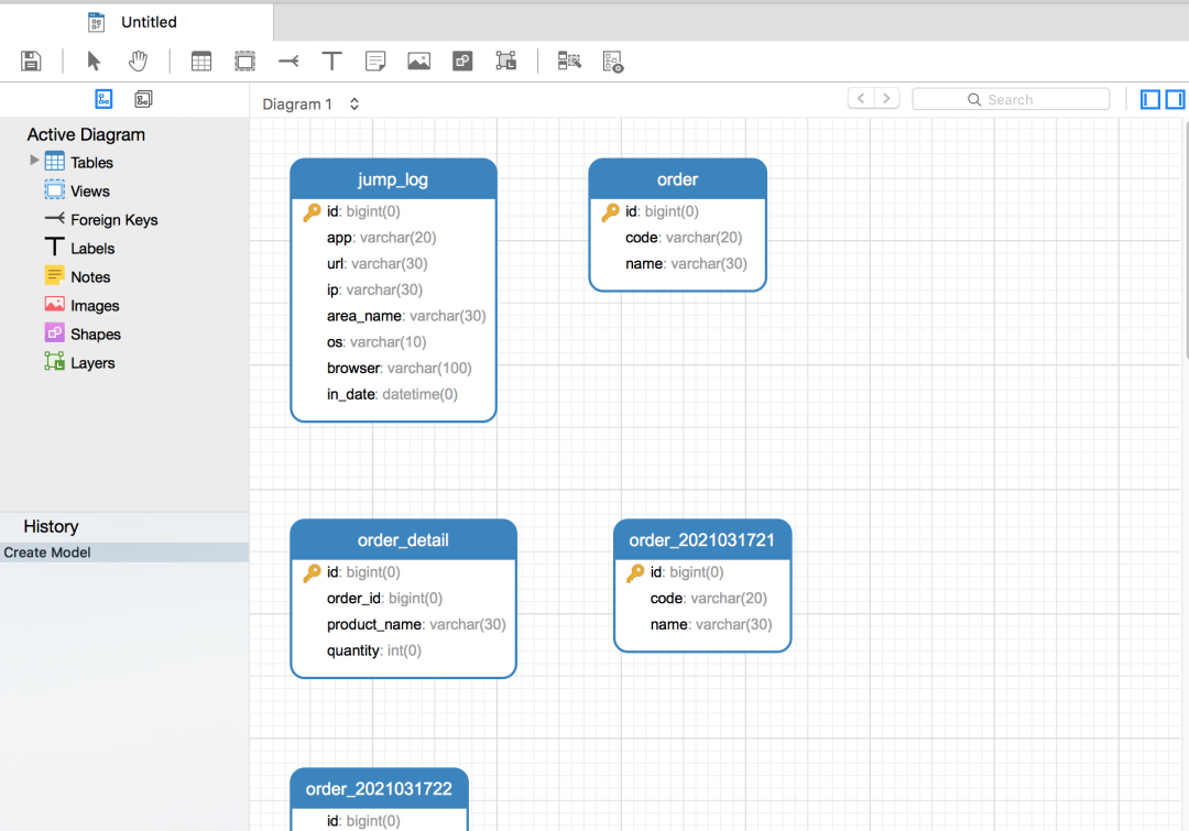 表的名称、表的字段,已经表之间的关联关系,通过这个model窗口能够非常直观的看明白。这个功能有点强喔。