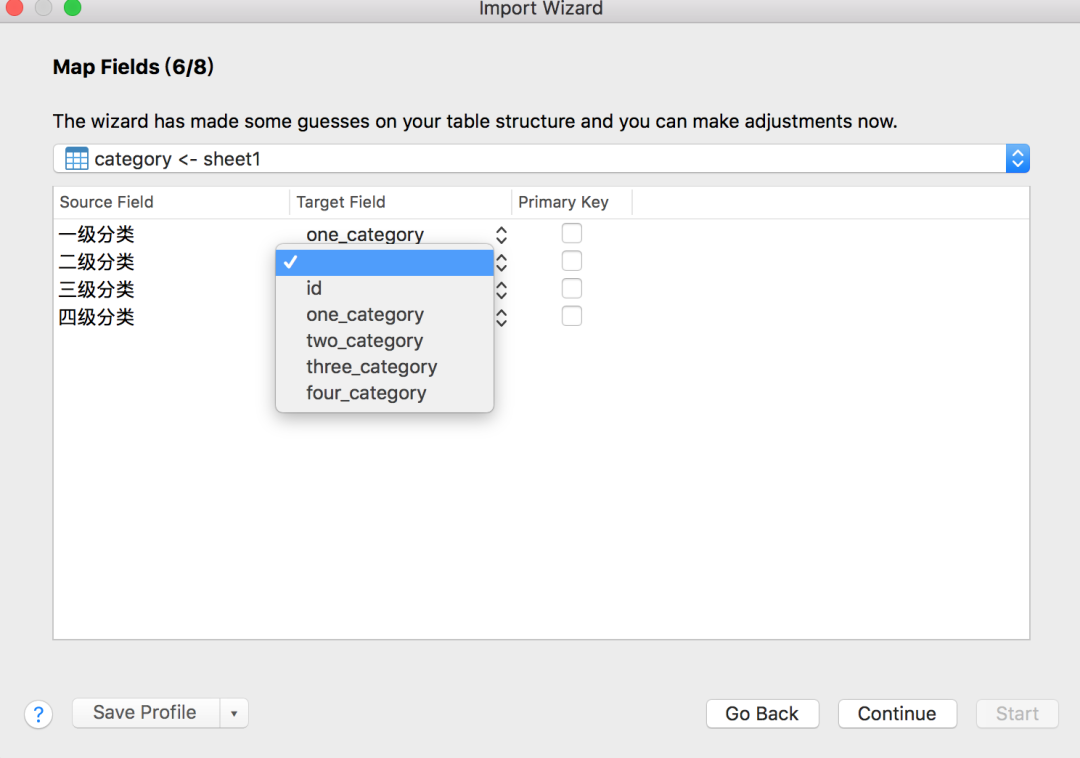接下来,还需选择excel文件的字段相对应的表中的字段:
