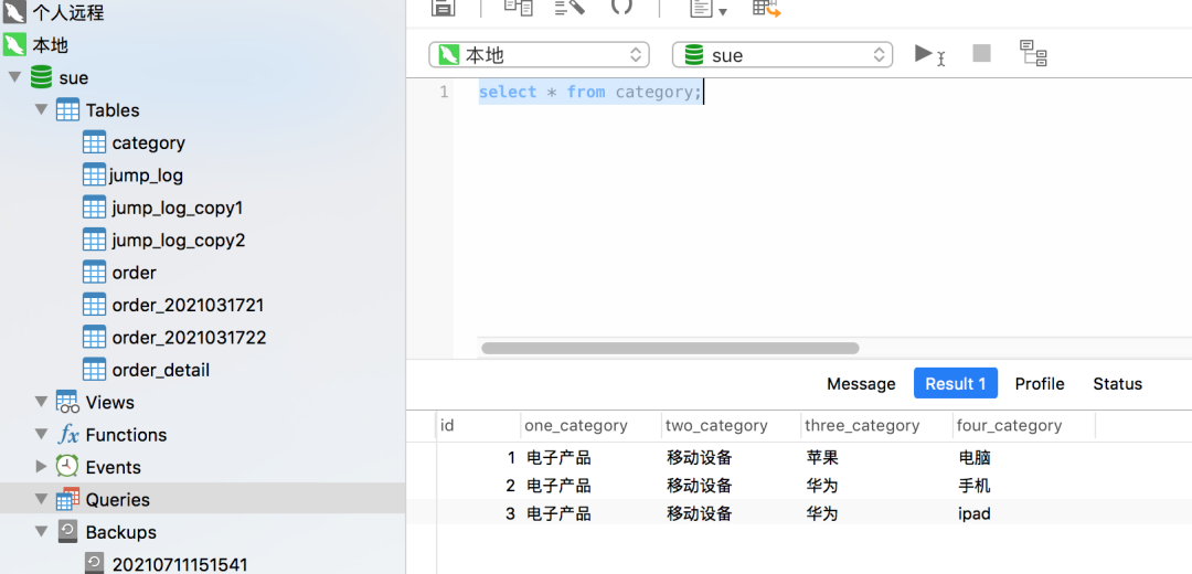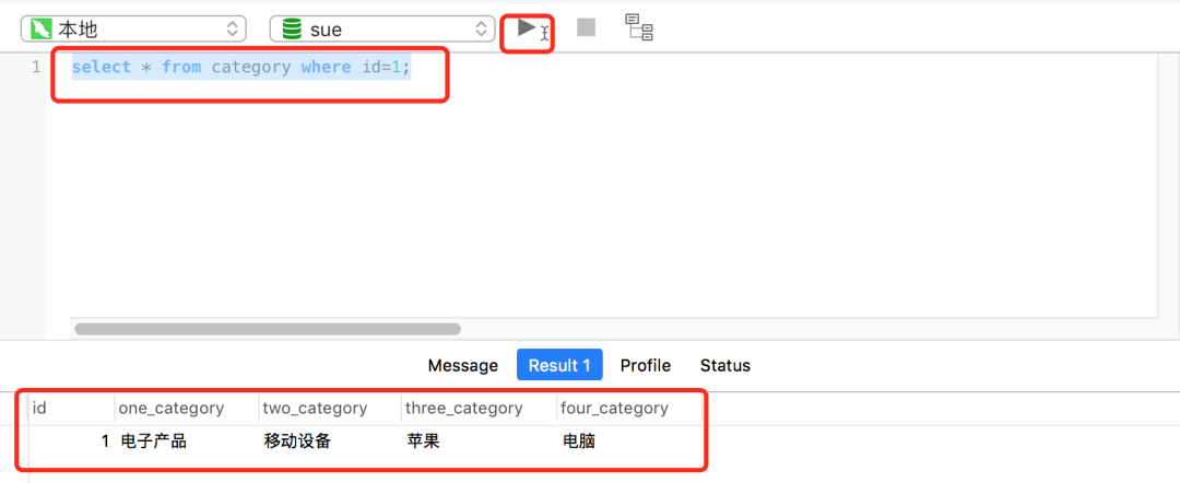 点击图中的类似箭头的按钮,就能执行该sql,执行结果会在下方的Result中显示出来。