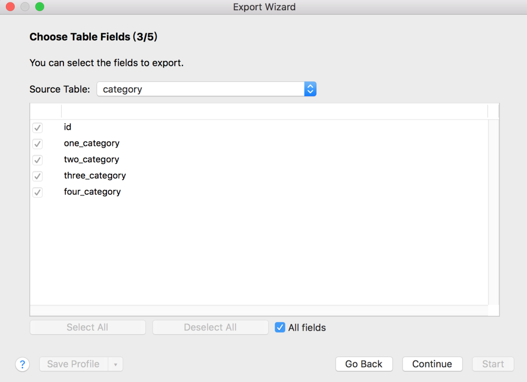 接下来,选择要导出的字段,允许只导出某些指定字段:
