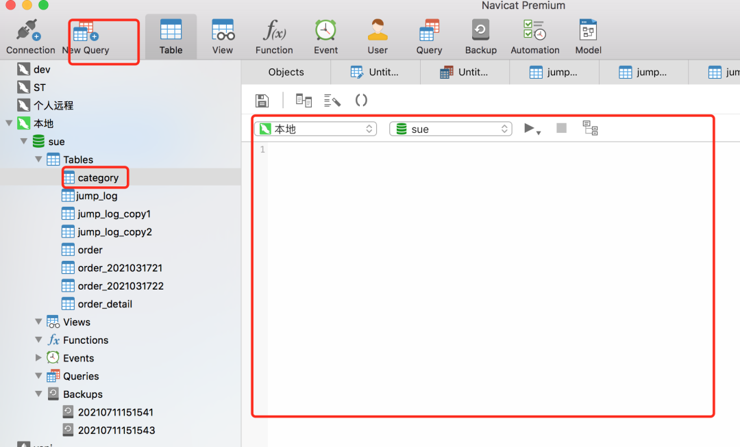 选中某张表,点击工具栏中的New Quer按钮,就会出现右边查询窗口:
