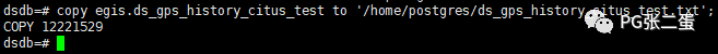 释义:将A服务器上dsdb库下egis schema里表ds_gps_history_citus_test数据拷贝到B服务器上/home/postgres/ds_gps_history_citus_test.txt文件里