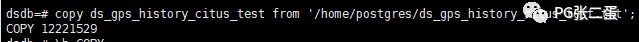 释义:将文件/home/postgres/ds_gps_history_citus_test.txt数据灌入表ds_gps_history_citus_test 中。